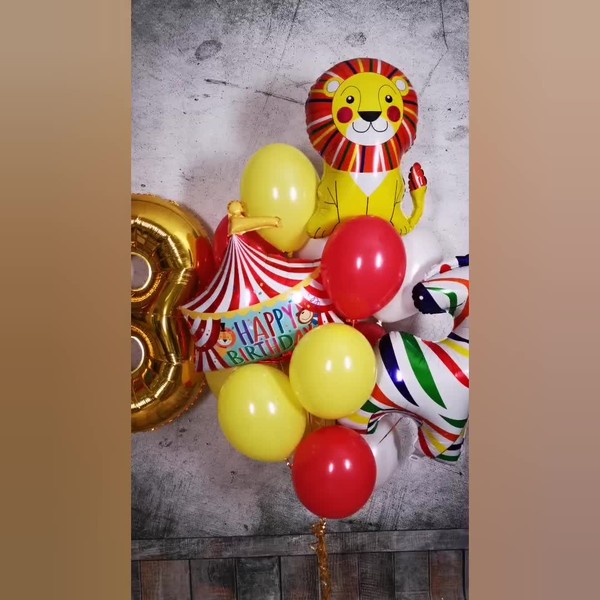 Набор из 13 шаров: цифра фольга (на выбор) - 1 шт, лев фольга - 1 шт, зебра фольга - 1 шт, шатер цирковой фольга - 1 шт, шар цветной - 9 шт, собраны в композицию .